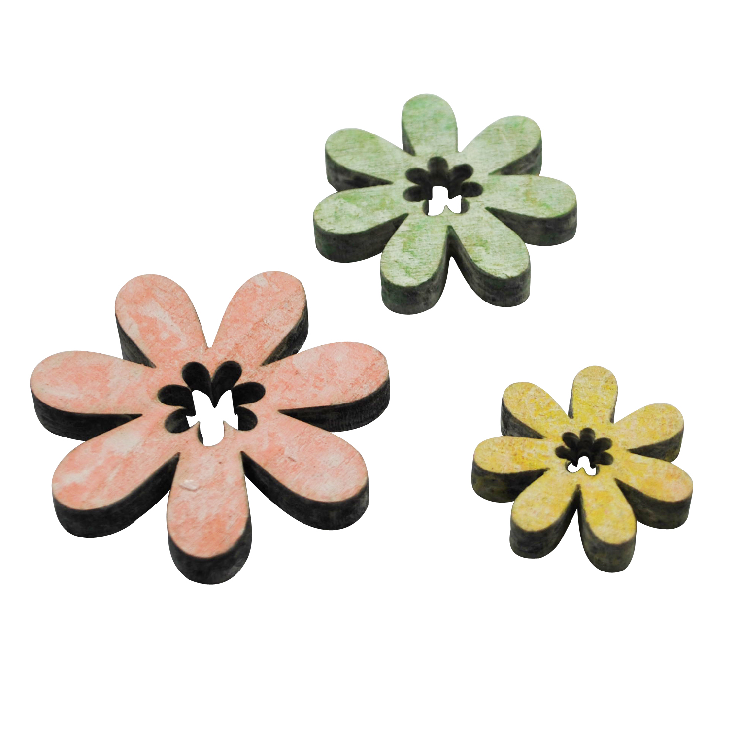 Schöne Holzblüten in drei verschiedenen Farben zum Streuen und Dekorieren. Diese Blüten sind dreifach sortiert in den Pastellfarben gelb, rosa und grün, die sehr schön als Tischdekoration auf dem Tisch verteilt werden können. Drei tolle Farben, die im Nu den Frühling ins Haus bringen. Die gelben Blüten sind 3 cm groß, die grünen 4 cm und die rosafarbenen Blüten aus Holz sind 5 cm groß